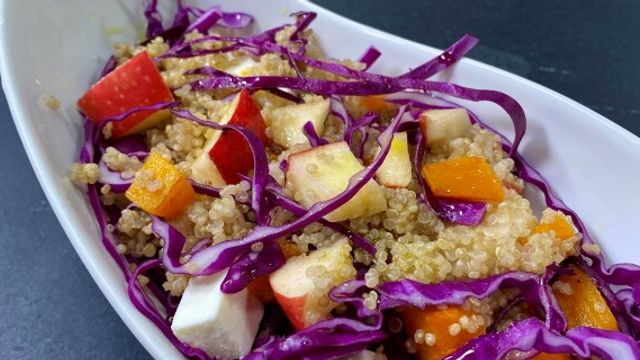 Tagliate a tocchetti anche una mela tipo Fuji e lasciate la buccia. Una volta pronta, lasciate coperta la quinoa e toglietela dal fuoco. Tagliate a listarelle sottili 300 grammi di cavolo cappuccio rosso. Sgranate con una forchetta la quinoa. Assemblate gli ingredienti e impiattate le singole porzioni.