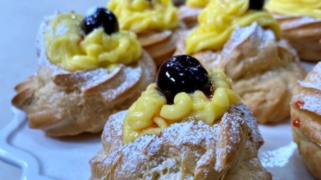 Per la crema pasticcera scaldate 200 ml di latte con 50 ml di panna e la scorza di un limone grattugiato. Lavorate tre tuorli con 50 grammi di zucchero e 25 grammi di amido di mais. Lavorate bene con la frusta. Aggiungete il latte caldo mescolate e rimettete sul fuoco. Con una sac à poche e un beccuccio a stella date forma alle zeppole che andranno in forno a 205 gradi per 25 minuti. Ultimate con le amarene sciroppate e zucchero a velo.