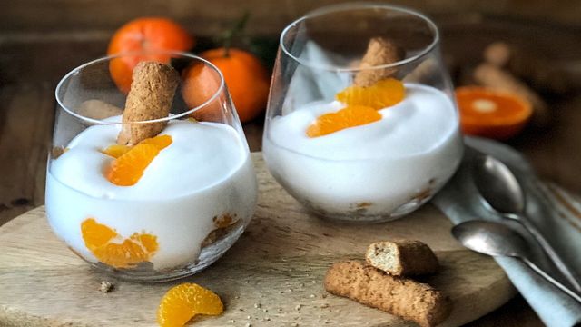 La mousse di aquafaba al mandarino è fatta con solo tre ingredienti, per un dolce al cucchiaio veloce.