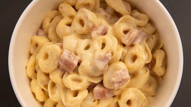Intanto cuocere i tortellini per 5 minuti e versarli in padella con la panna ed il prosciutto, aggiungere il parmigiano mantecando e servire immediatamente.