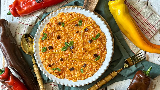 Sperimenta un viaggio culinario avvolto dai sapori audaci del Risotto ai Peperoni. La perfezione di questa ricetta sta nell'equilibrio tra la cremosità del riso carnaroli, l'intensità dei peperoni corno e la delicatezza della robiola.