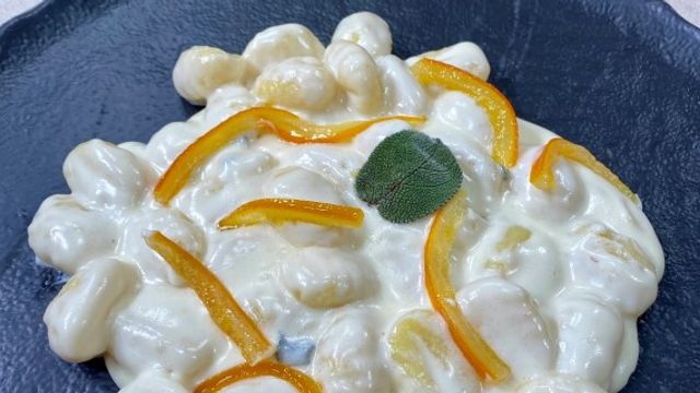 Scolate le scorze candite e lasciatele raffreddare su una griglia. Grattugiate del Fiore Sardo (pecorino a pasta dura) e versate la panna. Fate sciogliere con frusta a fuoco medio basso. Scolate gli gnocchi e saltate in salsa spezzettando qualche foglia di salvia. Impiattate servendo con le rance caramellate.