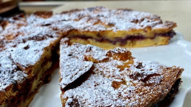 Spalmate sul panettone una confettura ai frutti di bosco o ai mirtilli. Versate poi il composto di latte e uova e zucchero. Coprite con altre fette di panettone e infornate a 180 gradi per circa per 30 minuti. Sfornate e spolverizzate di zucchero a velo.