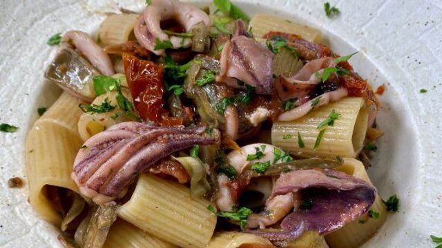 Rosolate l'aglio nell'olio e unite i totani. Tagliuzzate i pomodori sott'olio. Mettete a cuocere 360 grammi di pasta formato mezze maniche. Una volta cotta saltatela insieme al condimento e unite il prezzemolo tritato fresco.