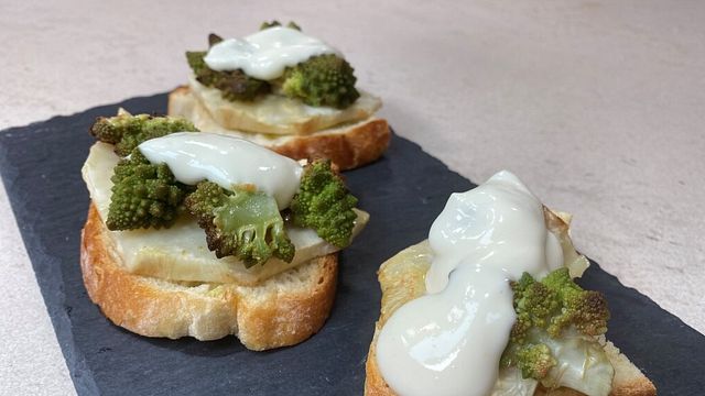 Tagliate a fette il sedano rapa e mettetelo in teglia con carta forno. Aggiungete le cime di cavolo romanesco. Condite con olio, sale e pepe e fate cuocere a 200 gradi fino a quando la verdura non sarà ben cotta. Fate scaldare anche il pane per la bruschetta condito con olio e sale.