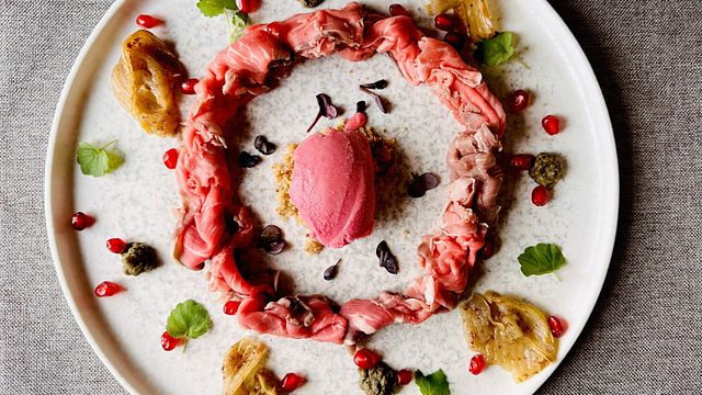 Impiattare formando una quenelle di sorbetto centrale, fettine di carne a giro accompagnate da piccole quantità di cipolla in agrodolce e sbriciolare il frollino.