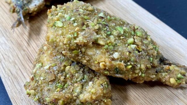 Mettete in padella uno spicchio d'aglio e dell'olio. Aggiungete 60 grammi di erbette. Salate, completate la cottura, asciugatele bene e tritatele. Aggiungete del pecorino grattugiato per completare il ripieno. Sbattete con del sale 2 uova. Realizzate una panatura con pangrattato e farina di pistacchi.