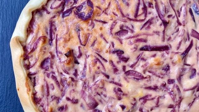 Cuocete 3 cipolle rosse grandi tagliate a fettine in padella con olio. Salate, aggiungete poca acqua coprite e fate appassire completamente. Preparate la besciamella: fate sciogliere 25 grammi di burro, aggiungete 25 grammi di farina e mescolando fate il roux. Lentamente aggiungete 250 ml di latte.