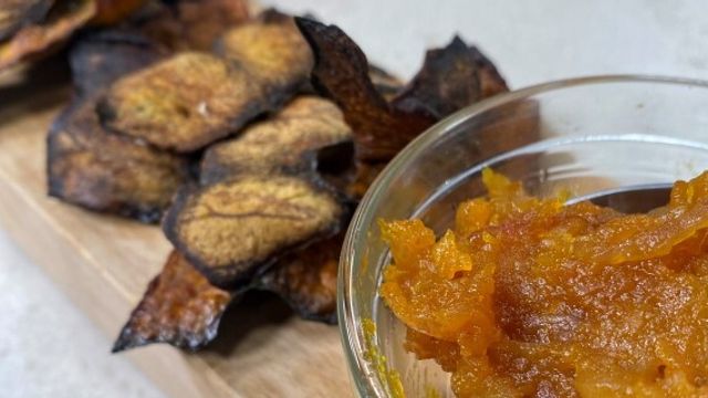 Aggiungete 100 grammi di zucchero di canna, un po' di acqua e mettete a cuocere senza coperchio per circa 1 ora. In ultimo aggiungete dell'aceto di mele. Mettete a friggere in olio bollente le bucce dopo averle tolte dal forno ed infini scolatelesu carta assorbente.