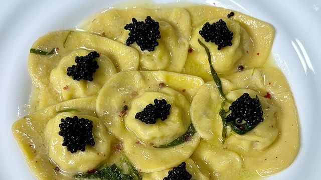 In un padellino preparare una liason con acqua, burro e dragoncello. Spennellare con acqua la sfoglia di pasta all’uovo. Apporre le palline di ripieno sulla striscia di pasta. Spennellare nuovamente e coprire con il secondo foglio di pasta all’uovo. Con un coppapasta tondo dare una prima forma poi tagliare il raviolo con coppapasta a forma di cuore. Immergere delicatamente i ravioli in acqua bollente per 2 minuti, scolare, condire con la liason di burro. Impiattare coprendo ogni raviolo con caviale e pepe rosa.