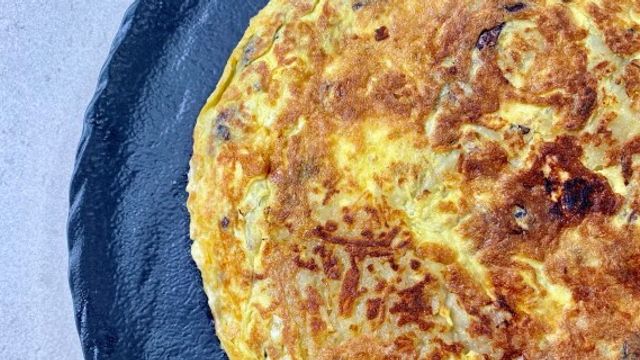 Cuocete le patate tagliate a julienne in padella con olio e uno spicchio d'aglio. Tagliuzzate 80 grammi di radicchio e ripassatelo in padella con uno spicchio d'aglio. Sbattete 5 uova con il sale.