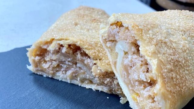 In una ciotola, mescola le fette di mele con il cocco grattugiato, i fichi secchi tagliati a pezzetti, lo zucchero e la cannella. Stendi la pasta e spennella con il burro fuso. Distribuisci uniformemente le mele sopra la pasta. Piega i lati corti della pasta verso l'interno quindi arrotola la pasta dal lato lungo e realizza uno strudel.