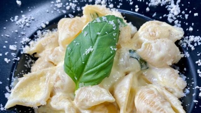 Portate a ebollizione l’acqua, salatela e cuocete la pasta secondo le indicazioni riportate sulla confezione. Nel mentre, scaldate la panna a fuoco dolce, poi unite i formaggi e fateli sciogliere mescolando con una frusta.