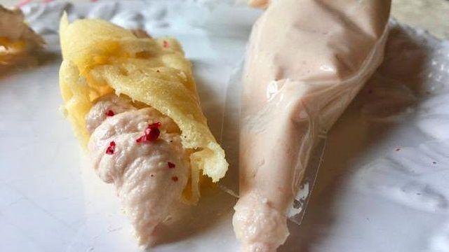 Frullate insieme ricotta e prosciutto cotto. Mettete la mousse in una tasca usa e getta e conservate in frigorifero fino al momento di farcire i cannoli. Dopo avere farcito decorate con briciole di pepe rosa che otterrete sbriciolando le bacche con le dita.