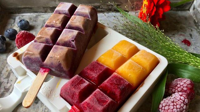 Aggiungete la polpa di frutta frullata direttamente nello stampo usando un cucchiaino e componete i gelati: pesca e albicocca, mirtilli e lamponi, mango e avocado. Potete combinare o sostituire la frutta a vostro gusto! Passate nel congelatore almeno 2-3 ore e conservate al fresco sino al momento di servire.