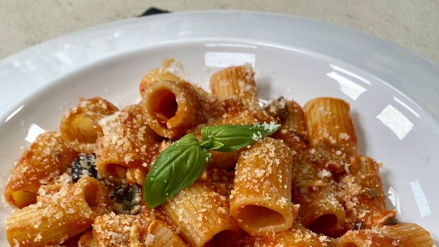 Prima di unire la pasta al sugo, aggiungete a quest'ultimo qualche foglia di basilico spezzettata. Allungate con un po' d'acqua di cottura e olio a crudo. Infine, aggiungete del formaggio grattugiato.