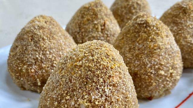 Modellate l'impasto, mettete al centro un pezzetto di scamorza e chiudete bene dando la forma di un arancino. Una volta data la forma, passate l'aranciccio nel pangrattato. Per la cottura potete friggere in abbondante olio di semi oppure in forno a 200 gradi per 15/20 minuti.