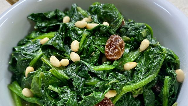 Mettete in ammollo 40 grammi di uvetta in una ciotola con dell’acqua tiepida per 10 minuti. Mondate e lavate 1 chilo di spinaci, sbollentateli in abbondante acqua salata e, una volta cotti, scolateli bene e teneteli da parte. Nel frattempo, in una padella a fuoco basso, tostate 60 grammi di pinoli, facendo attenzione a non bruciarli.