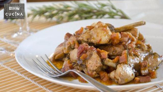 Il coniglio al prosciutto e vino bianco � un secondo piatto di carne gustoso realizzato in padella con un ricco soffritto di cipolla, carota e prosciutto crudo, il tutto aromatizzato dal vino bianco, dal rosmarino e dalla maggiorana. Non fate asciugare troppo il coniglio in cottura, visto che il suo principale condimento nel piatto dovr� essere proprio il fondo di cottura. Potete sostituire il prosciutto crudo con cubetti di pancetta e aggiungere, se preferite, una foglia di alloro per accentuare l'aroma!