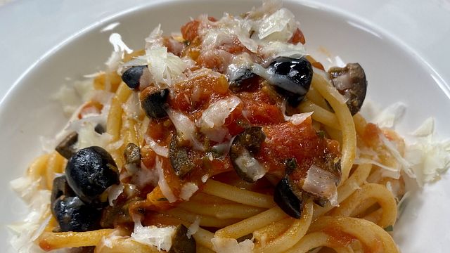 Una volta che l'acqua bolle, buttate 320 grammi di pasta lunga e scolatela quando è ancora al dente. Saltatela nel sugo allungando con un po' di acqua di cottura. Infine aggiungete un filo d'olio, le olive nere e del prezzemolo tritato. Una volta impiattato, aggiungete a piacere un po' di caciocavallo.