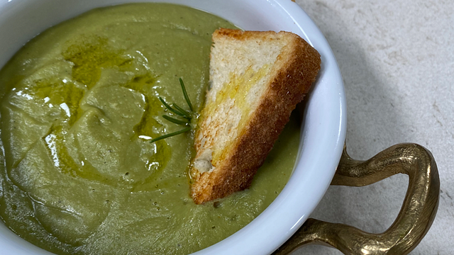 Portate il tutto a ebollizione, riducete il fuoco e lasciate cuocere per circa 30 minuti fino a quando le fave sono morbide. Nel frattempo preparate il pane per crostini tostandolo in padella con un filo d'olio. Riducete con un frullatore ad immersione la zuppa in una consistenza cremosa. Servite la crema di fave guarnendo con un filo di olio e accompagnata da crostini di pane.