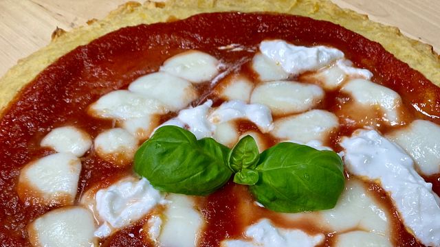 Una volta sfornata, farcitela con passata di pomodoro (condita precedentemente con olio e sale), abbondante mozzarella, un po' di burrata a crudo e una fogliolina di basilico fresco.