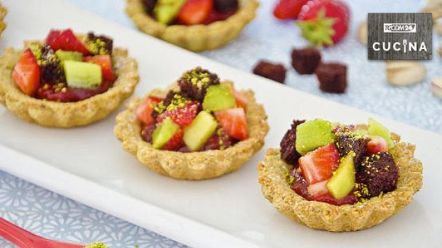 Le tartellette al pistacchio sono dei pasticcini golosi e leggeri realizzati con una pasta frolla al pistacchio (senza burro e uova) farcita con confettura di fragole, macedonia e cubetti di torta al cioccolato.