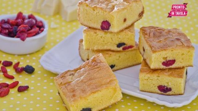 I brownies al cioccolato bianco, conosciuti anche come whities, sono una variante golosa dei tradizionali brownies americani al cioccolato fondente. Come dice il nome stesso, sono bianchi, ma altrettanto irresistibili! Sono arricchiti da frutta disidradata e farina di riso e hanno una consistenza soda ma una scioglievolezza unica. I whities vengono fatti raffreddare e tagliati a quadrotti proprio come vuole tradizione, e magari potreste impreziosirli con della frutta fresca come fragole o ciliegie!
