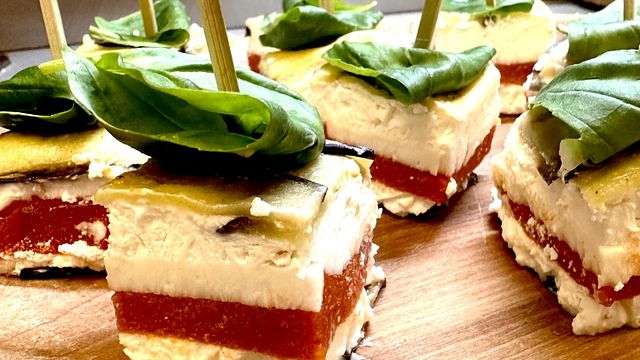 L’estate si avvicina e anche la voglia di un aperitivo sfizioso, gustoso, ma che non appesantisca. Vi proponiamo dei bocconcini tricolore: mozzarella, basilico, melanzane caramellate, purea di pomodori e mousse di ricotta.
