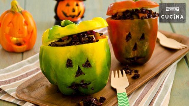 Con uno spilucchino incidete un lato dei peperoni formando a vostro piacere un volto: occhietti, naso e bocca per i vostri peperoni stregati. In una padella scaldate l’olio e fatevi dolcemente imbiondire la cipolla. Aggiungete i cubetti di peperoni e cuoceteli a fuoco vivo per una decina di minuti.