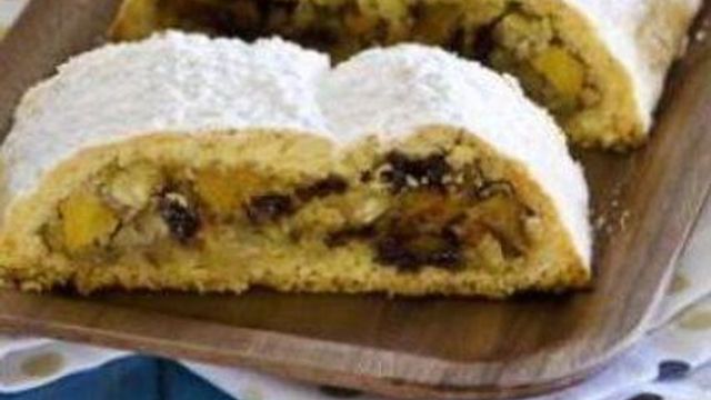 Richiudete le estremit� verso il centro, sigillando bene. Mettete lo strudel su una teglia rivestita di carta da forno, quindi infornatelo a 180 gradi per circa 30 minuti. Quando sar� ben dorato, sfornatelo, lasciatelo raffreddare e spolverizzate di zucchero a velo.