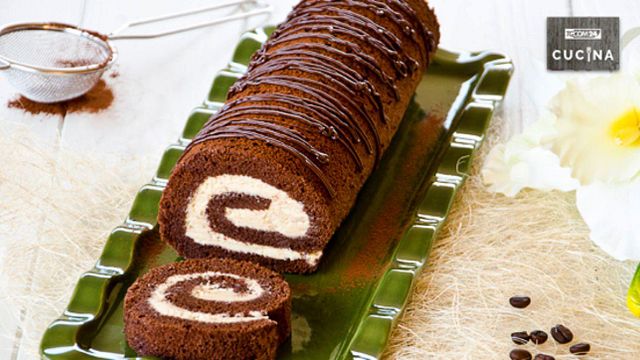 Il rotolo al caffè è un dolce goloso e scenografico preparato con una pasta biscotto al cacao farcita con una crema di mascarpone al caffè.