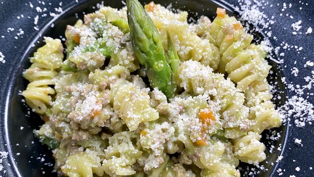 Una volta cotti gli asparagi, togliete le punte e frullate il resto con olio, sale, pepe a piacere e un po' di acqua di cottura fino a formare una crema. Nel frattempo che cuoce la pasta, unite la crema al macinato e amalgamate bene. Una volta scolata la pasta, saltate bene e completate a piacere con del formaggio grattugiato.