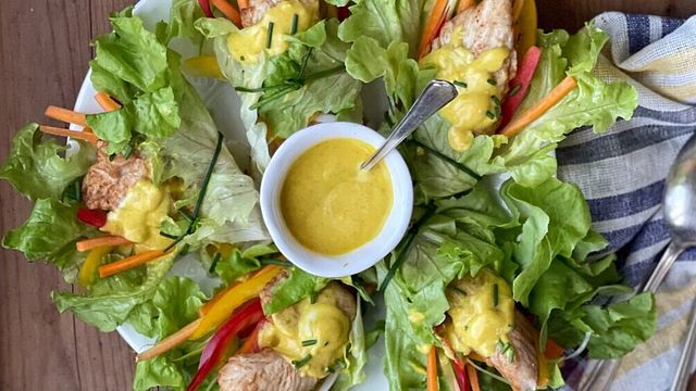 Disporre gli involtini di insalata su un piatto da portata e servire con la salsa al curry rimasta.