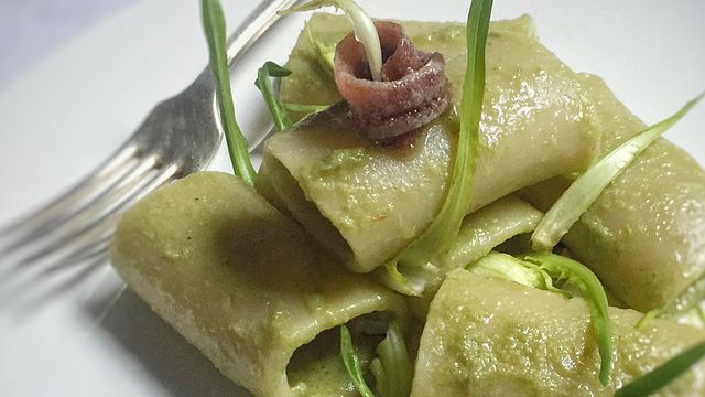 Tanti i nomi con cui viene definita: cicoria asparago, cicoria catalogna o più semplicemente puntarelle. Comunque la si chiami, si tratta di una varietà di cicoria tipica italiana, molto diffusa nel Lazio, in Veneto e in Puglia, da dicembre ad aprile. In questa ricetta saranno l'ingrediente di un insolito pesto saporito per condire dei paccheri di kamut.