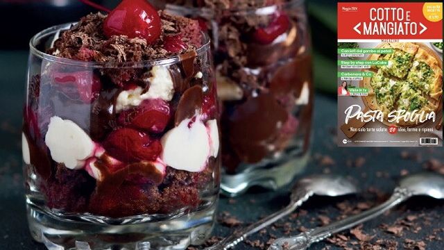 Prendete i vostri bicchierini, adagiate sul fondo un pezzo di pan di Spagna, aggiungete uno strato di crema bianca, amarene con un po’ del loro succo e abbondante ganache, proseguite in questo modo fino al bordo, cospargete con cioccolato fondente tritato e un’amarena.