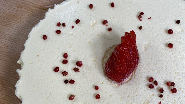 Strizzate bene la gelatina e scioglietela con un po' di acqua calda e aggiungetela al composto insieme a 200 ml di panna montata e 200 grammi di fragole tagliate a fette. Versate il composto sopra la base di biscotti e lasciate solidificare in frigorifero per almeno 4 ore. Una volta pronta, decorate a piacere con delle fragole e qualche granello di pepe rosa.