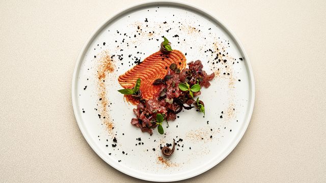Stendere la crema di datterini confit in un piatto, adagiare la tartare di tonno, guarnire con le acciughe del cantabrico arrotolate, capperi essiccati, germogli, foglie di cappero e polvere di olive nere.