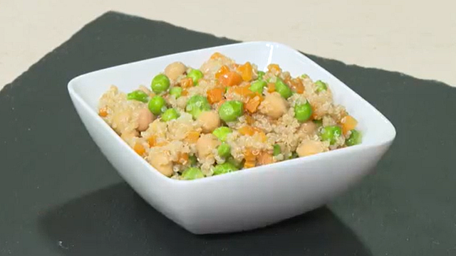 Come prima cosa sciacquate una tazza di quinoa in modo da togliere tutte le impurità e successivamente tostatela in una casseruola aggiungendo acqua calda e sale fino a completarne la cottura. Nel frattempo lessate una tazza di piselli e 2 carote tagliate a dadini.