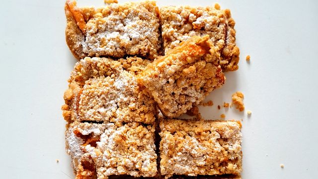 Foderate una teglia quadrata da 23 cm o rettangolare 18x30 cm con carta forno. Stendete 2/3 dell'impasto in uno strato uniforme. Stendete la confettura poi il ripieno di albicocche e l'eventuale succo. Sbriciolate il rimanente impasto assicurandovi di ottenere una copertura uniforme creando delle grosse briciole.