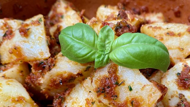 Lasciate cuocere per qualche minuto, togliete lo spicchio d'aglio e frullate aggiungendo un po' di olio a crudo. Una volta pronta, aggiungete la salsina alle patate e mischiate bene per amalgamare il tutto. Decorate infine con qualche foglia di basilico fresco.