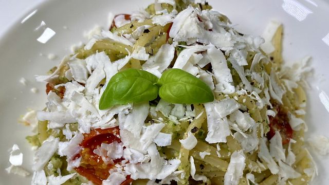Una volta pronte, togliete l'aglio e frullate tutto insieme alle mandorle. Una volta che la pasta è cotta, amalgamatela bene con il pesto, aggiungete i pomodorini, un filo d'olio, della ricotta salata grattugiata e basilico a piacere.