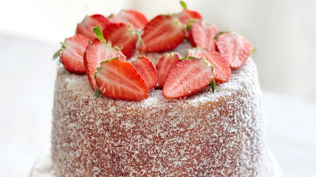 Vale la prova stuzzicadenti. Sfornate, capovolgete subito lo stampo sui suoi piedini e aspettate che la torta di stacchi da sola. Altrimenti aiutatevi con un coltello a lama liscia e sottile passandolo tutto intorno al bordo, per staccarla senza romperla (ma questo andrà eventualmente fatto dopo diverse ore dal capovolgimento). Trasferite su un piatto o vassoio e spatolate con la confettura di fragole. Spolverizzate la torta con il cocco rapé e poi decorate il top con le fragole. Si conserva in frigo fino a due giorni.