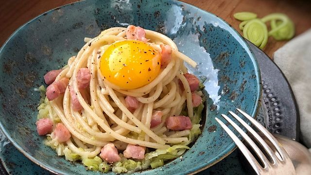 Un nido di spaghetti mantecati con porri stufati e pecorino il tutto coperto da una montagna di guanciale croccante, pepe e un tuorlo d’uovo pastorizzato in casa. Gli ingredienti della ricetta ci sono tutti ma il piatto tipico della tradizione laziale è servito in modo diverso.