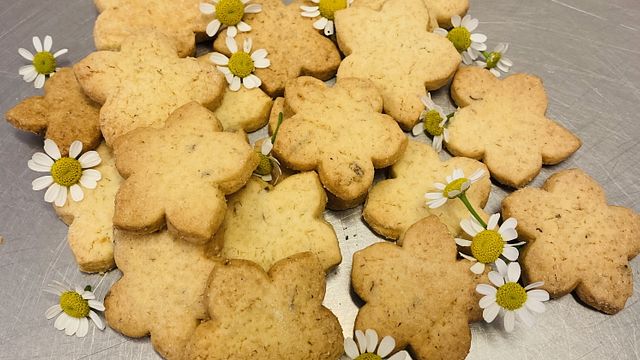 Lavorare burro e zucchero fino ad amalgamarli (se il lavoro si svolge con la planetaria utilizzare frusta k o foglia); aggiungere uovo, scorza di limone, camomilla.