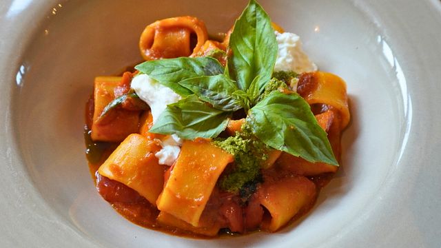 Terminare il piatto aggiungendo sopra la burrata e una cima di basilico.