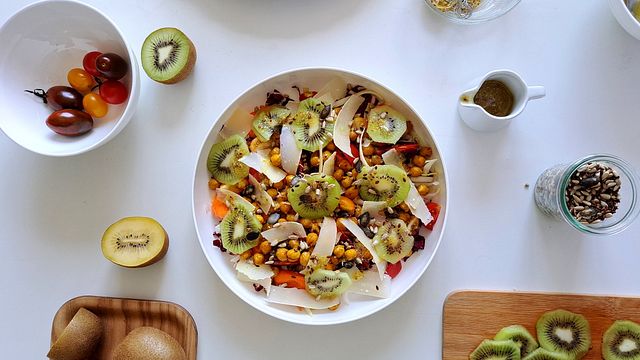 Unite le verdure e i ceci in una ciotola da portata poi appoggiate sopra i kiwi, il formaggio e i semi oleosi. Condite con la vinaigrette e servite.