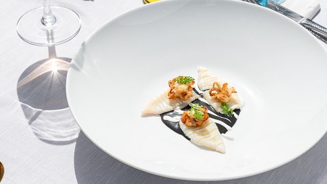 L’antipasto Calamaro bianco e nero di Pasquale Tozzi – l’executive chef del Ristorante Il Pescatore e del Ristorante Magnolia - è un omaggio ai sapori e ai profumi del mare. Nel piatto, i calamari bianchi scottati vengono serviti con due salse, una al nero di calamaro e latte di mandorla e una con yogurt e cetrioli, teste di calamaro in tempura e foglie di cerfoglio.