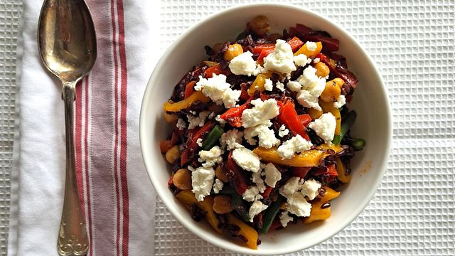 Versate il riso in una ciotola capiente poi aggiungete i peperoni, i fagiolini e i ceci.