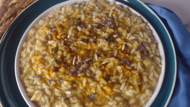 Il risotto con melanzana, ras el hanout, semi misti e fiordaliso è un piatto creativo e aromatico che combina sapori e texture uniche. Ecco una semplice ricetta per prepararlo.